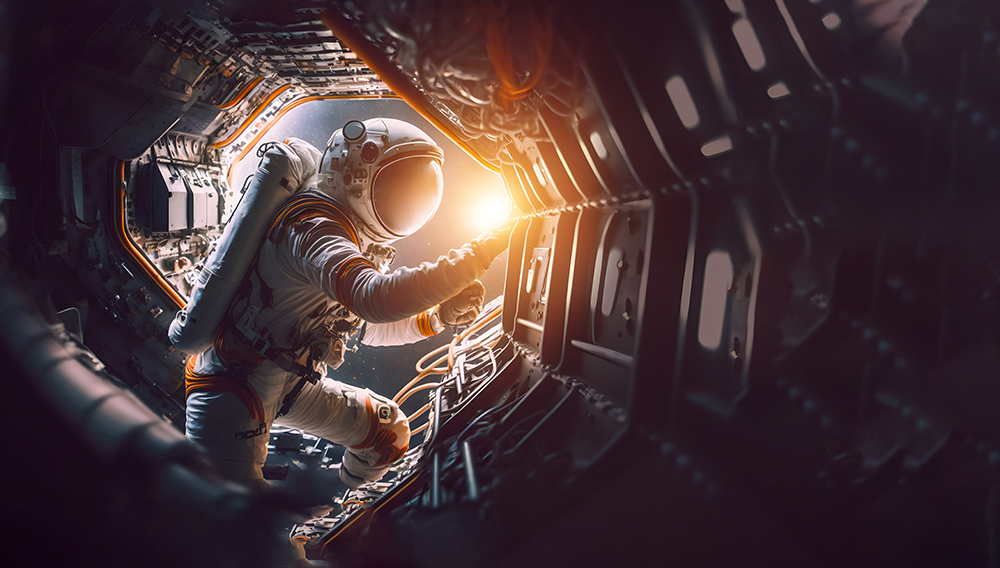 Astronauts work in outer space on the outer shell of the space orbital station. Generative AI
