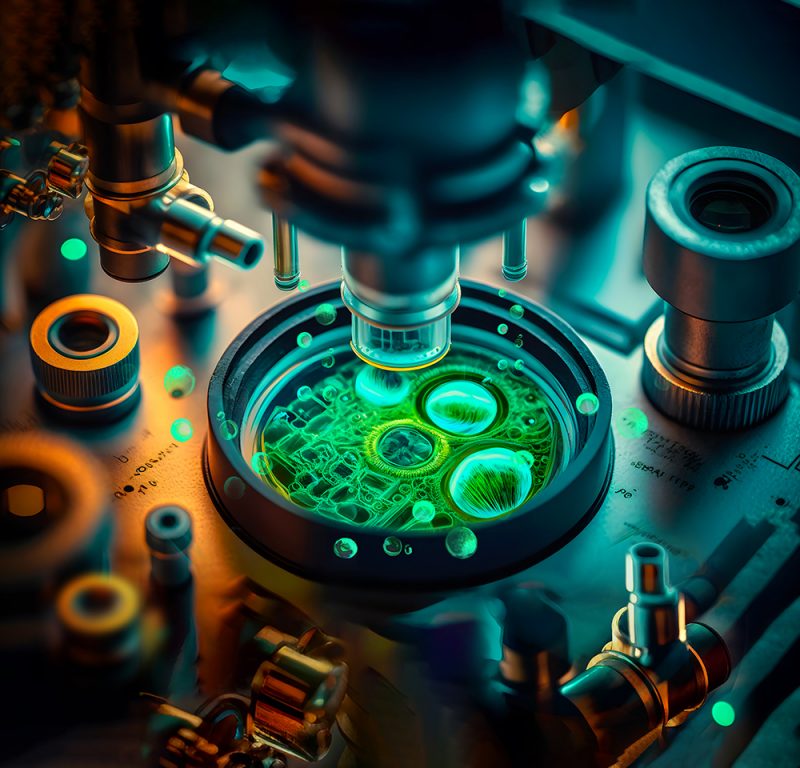 Close-up shot of microscope with metal lens at laboratory. Neural network AI generated