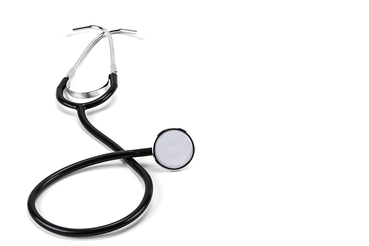 Close up view of black stethoscope isolated on white background
