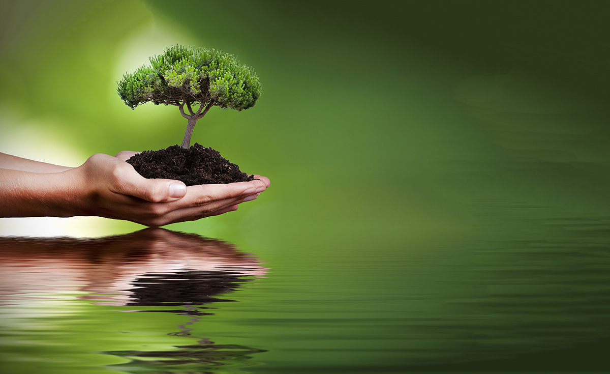 tree in hands with reflection in water