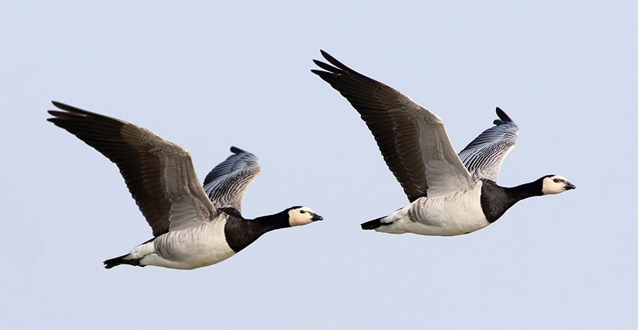 Two European Barnacle Geese (Branta leucopsis) in fast flight