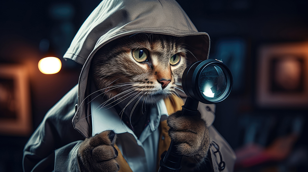 Whimsical cat investigator with a flair for solving mysteries, using a magnifying glass and detective tools